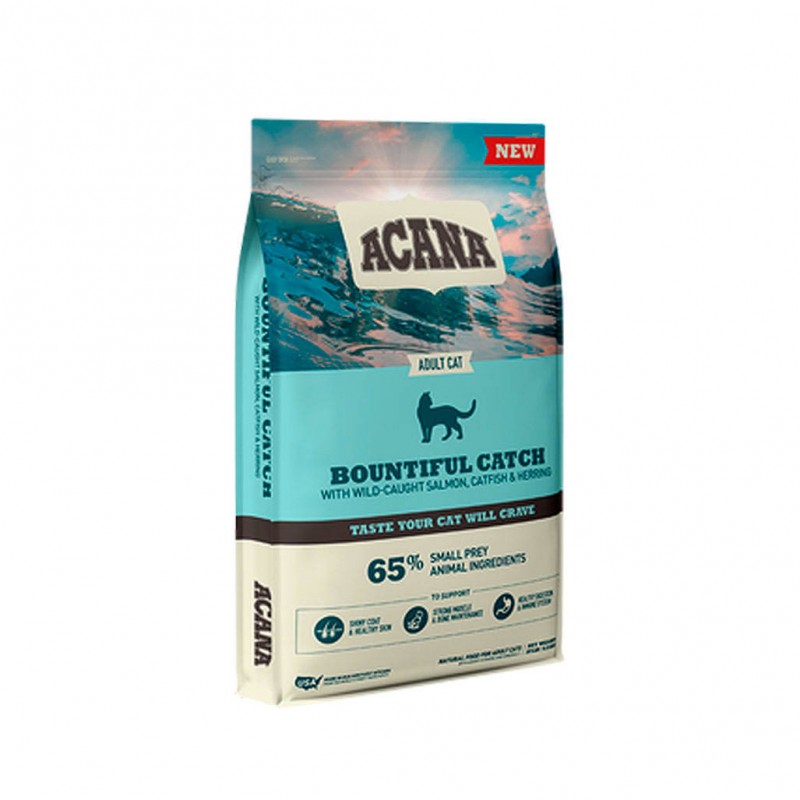 Acana Bountiful Catch® es un alimento para gatos que va más allá del primer ingrediente. Es una receta elaborada cuidadosamente de principio a fin. Alimente a su gato de interior con una dieta repleta de ingredientes animales de calidad. La receta de Acana® Bountiful Catch está repleta de 65% * de ingredientes animales de calidad como salmón salvaje, bagre y arenque entero, entregados crudos en su forma más nutritiva. En nuestra cocina nunca se agregan colorantes, sabores o conservantes artificiales.
