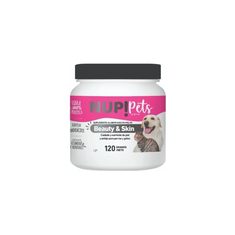 NUP!Pets Beauty & Skin es un suplemento que posee vitaminas, minerales, aminoácidos y una alta concentración de prebióticos (fibra alimentaria) ideal para fortalecer la salud corporal, pelaje y piel de nuestros perros y gatos. Las vitaminas, aminoácidos y prebióticos aportan: más defensa, más nutrición y más bienestar. Envase de 120 g.