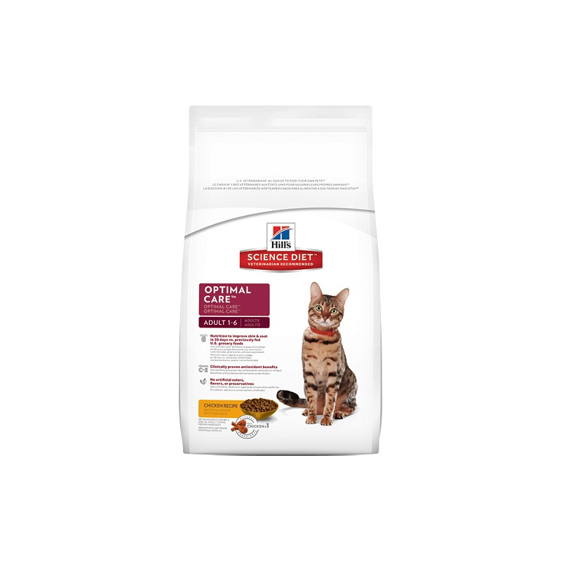 Pollo, grano entero de trigo, gluten de maíz, grasa de cerdo, pollo Comida, pulpa de remolacha deshidratada, arroz integral, sabor de hígado de pollo, sulfato de calcio, ácido láctico, cloruro de potasio, aceite de pescado, aceite de soja, sal yodada, cloruro de colina, taurina, vitaminas (E suplemento vitamínico, L-ascorbilo-2-polifosfato (fuente de vitamina C), niacina Suplemento, mononitrato de tiamina, complemento de vitamina A, pantotenato de calcio, suplemento de riboflavina, biotina, suplemento de vitamina B12, clorhidrato de piridoxina, ácido fólico, la vitamina D3 Suplemento), minerales (sulfato ferroso, óxido de zinc, Sulfato de Cobre, Manganoso Óxido, calcio yodato, selenita de sodio), fibra de avena, mezcla de tocoferoles de frescura, sabores naturales, Beta-Caroteno, Manzanas secadas, brócoli, zanahorias secas, arándanos secos , guisantes secos.