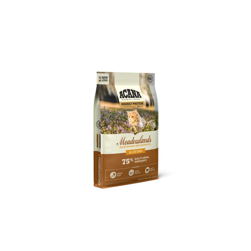 Con un 75% de carne, Acana Meadowland para gatos contiene pollo de corral, pavo , huevos del nido, bagre azul y trucha arcoíris. Nuestra carne se entrega fresca o cruda diariamente en proporciones de Presa Entera para semejar la dieta evolutiva de tu gato y promover la salud óptima sin largas listas de suplementos o aditivos sintéticos.