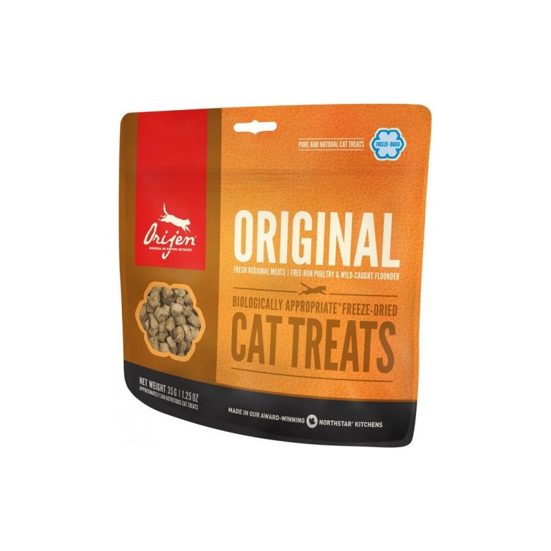 Hecho con 100% de aves de corral y pescado, nuestras golosinas para gatos ORIJEN ORIGINAL biologically appropiate están completamente libres de carbohidratos. Recomendamos ofrecer golosinas ORIJEN con moderación como una recompensa saludable, ya que posee solo 1 caloria por premio, disfrute de la experiencia de recompensar a su querido compañero.